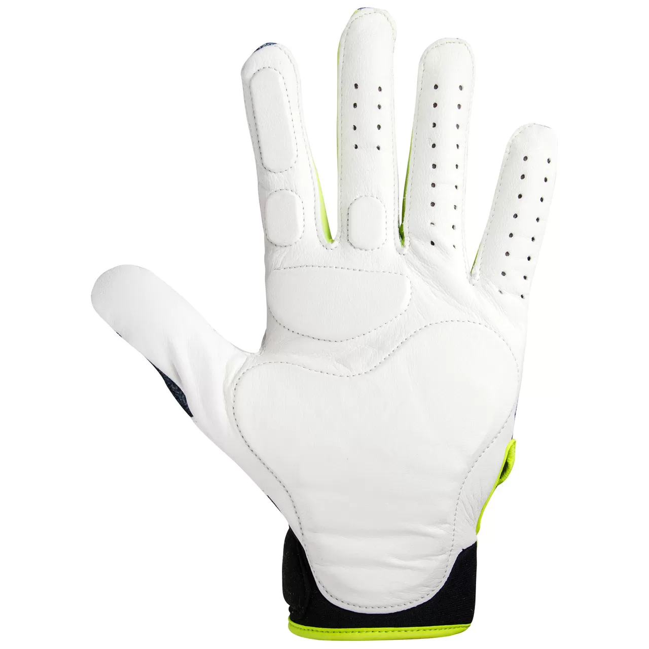 The full palm protection, inner glove from All-Star Sporting Goods is designed for both catching and fielding. Features lightweight and thin palm and finger pads, which absorb and spread shock over a larger surface area, limiting the amount of nerve damage in the hand after repeated hard balls. Padding extends all the way to the wrist for those wild, bad hops and all the way through the index finger with extra padding on the side wrist bone. The palm is constructed of white goat skin leather and the back is a seamless moisture wicking stretch material. Sold individually for use on one hand.