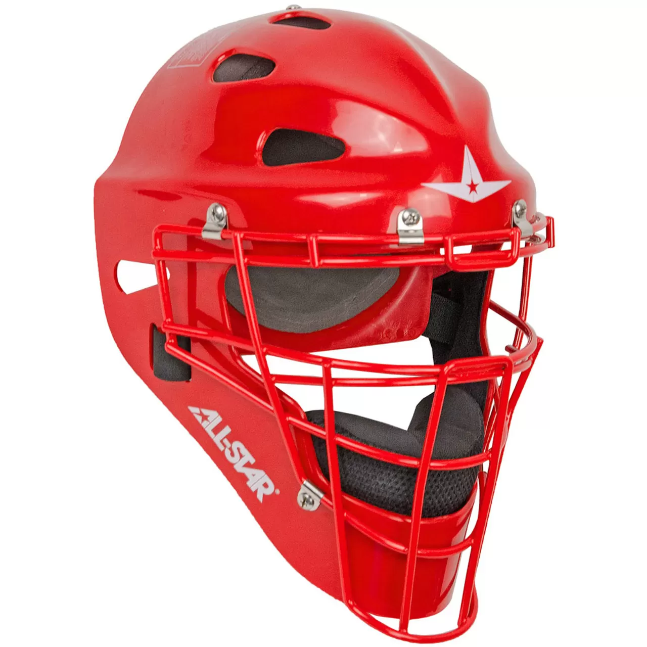 The All Star’s Player’s Series helmet features a dual density foam liner, ABS plastic shell and a steel cage.