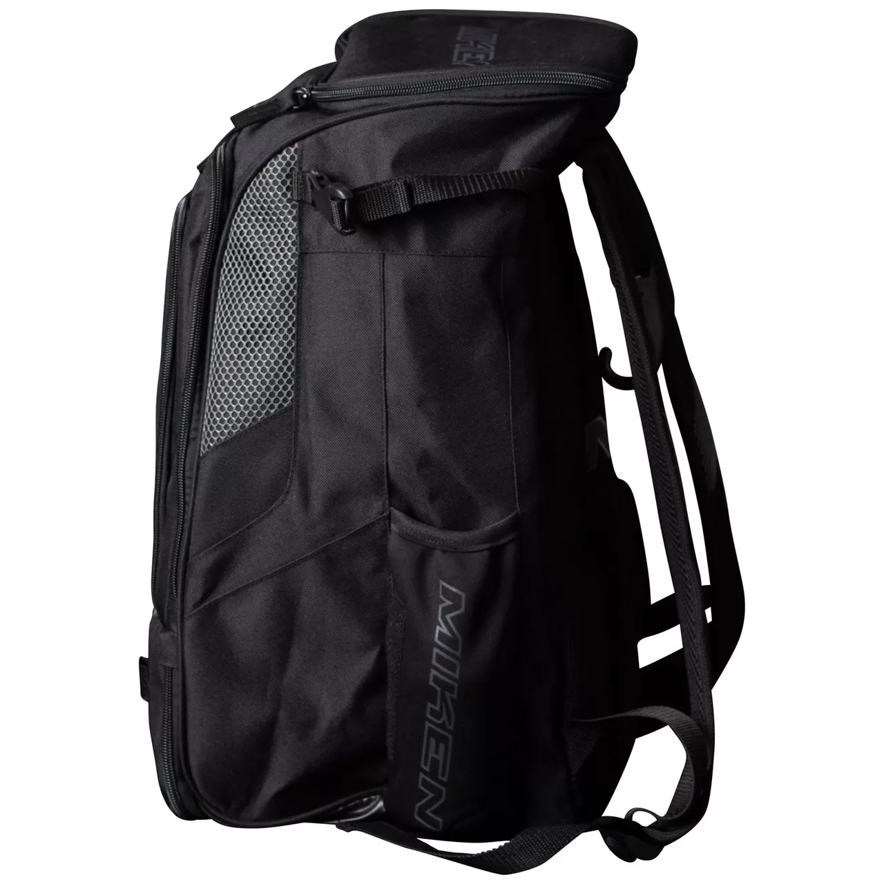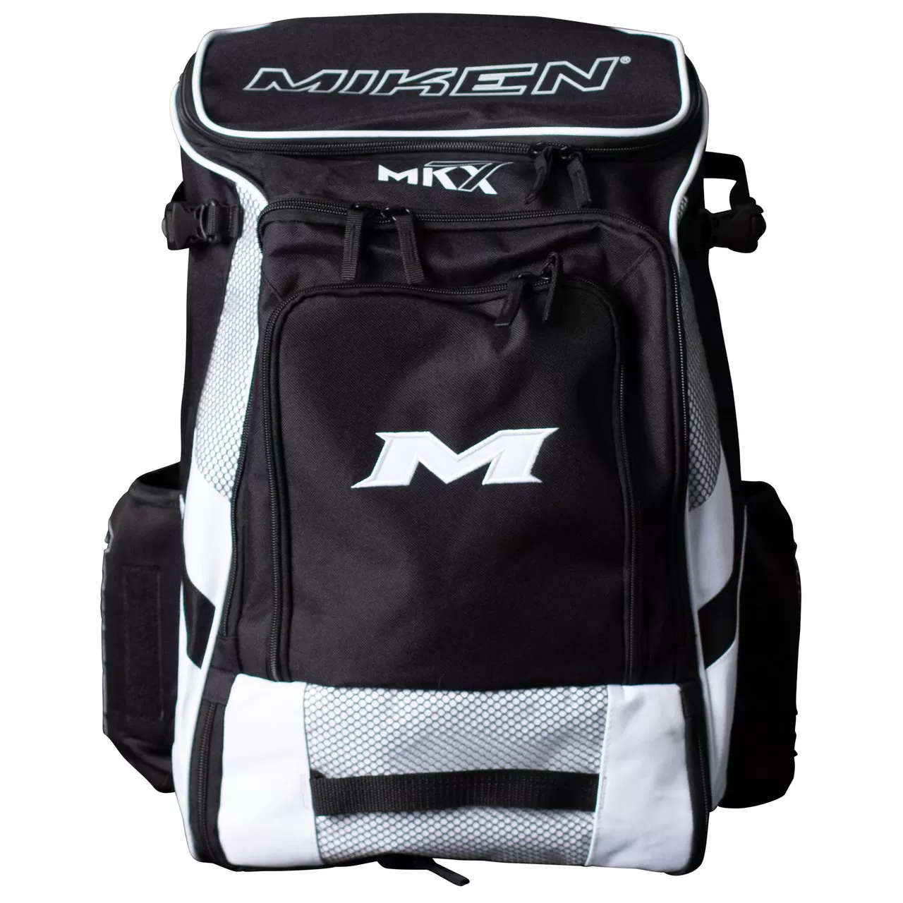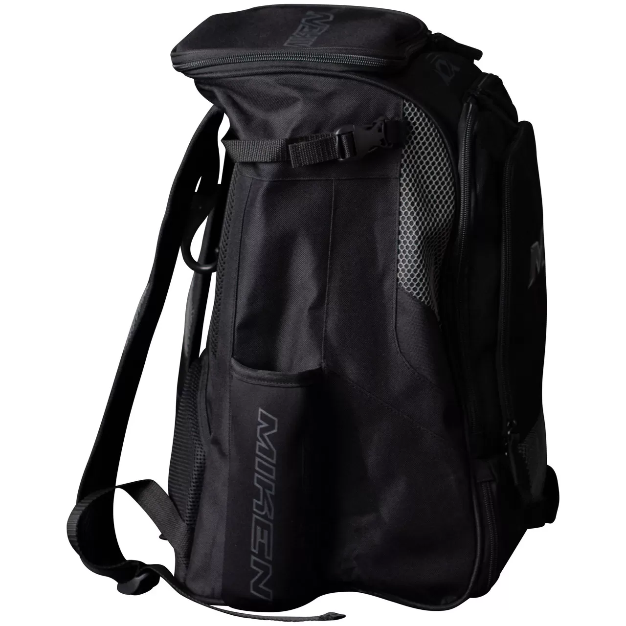 The all new Miken Backpack features 2 elasticized neoprene bat sleeves, a durable “J” style fence hook, top valet tray with lined pocket for phone, front storage pocket, separate shoe pocket on bottom, Velcro strip for exterior batting glove storage, and an easy to clean tarpaulin bottom.