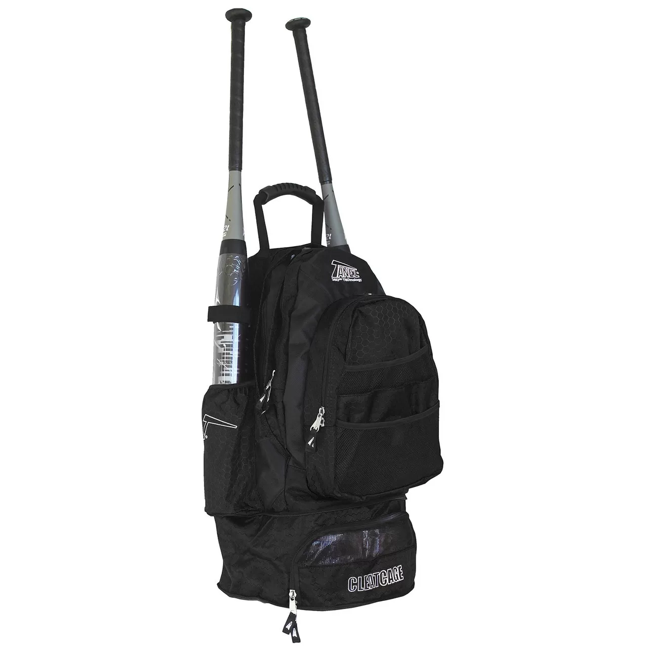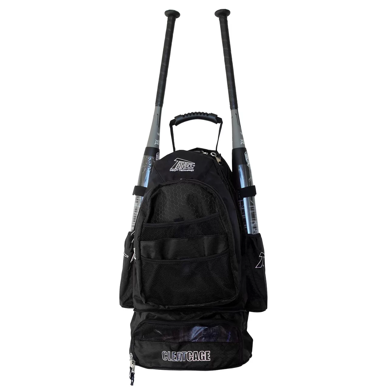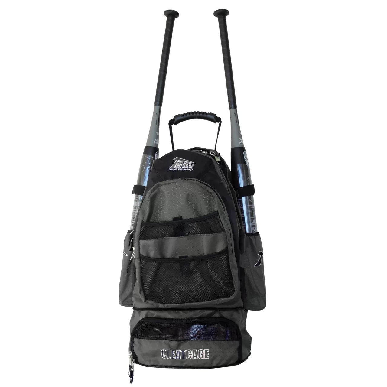 The Tanel 360 Bat Pack is compact, yet spacious enough to hold all of your equipment in an easy to carry backpack-style bag. Tanel’s high-end quality and attention to detail is exemplified in this bag. Stylish and durable with plenty of pockets, sturdy all-metal fence hooks, and all-access zippers. Built with heavy-duty 600 denier and beautiful honeycomb Dolby nylon. Here you can store your iPod and listen through headphone ports plus store lots of other stuff. Exclusive Cleat Cage stays tucked away when you are not using it and it drops down and keeps your cleats and their dirt in a separate compartment. Mesh ventilation lets them cool and dry on the way home.
